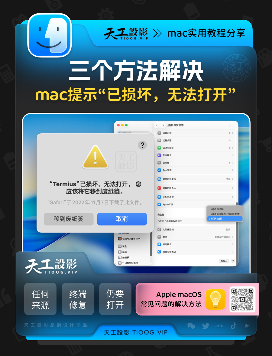 相信大家在使用mac电脑过程中肯定遇到过安装软件时提示“已损坏,无法打开”的问题,这其实是mac电脑启动了安全机制,安装软件时通常默认只信任mac官方App Store上下载的软件以及拥有开发者 ID 签名的软件,所以也会阻止非官方渠道的App Store和浏览器等第三方渠道获取的软件,那么应该如何解决呢,本期天工設影TIOOG将和您分享三种方法就可以解决这个问题。